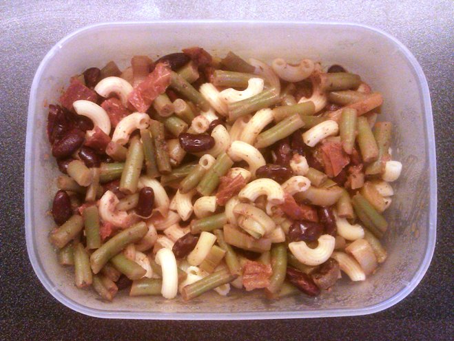 tortellini wymieszać z brokułem, fasolką, szynką pokrojoną w kostkę, polać oliwą, przyprawić